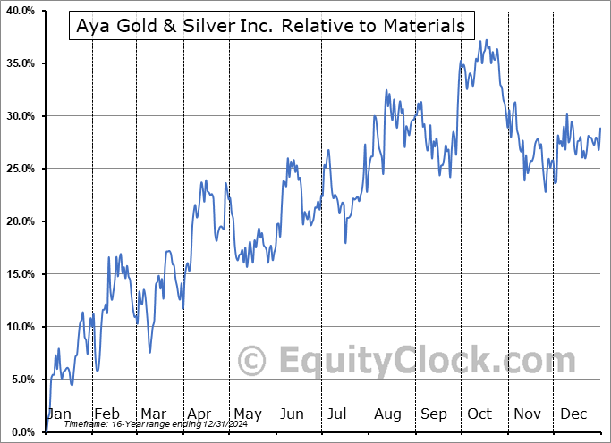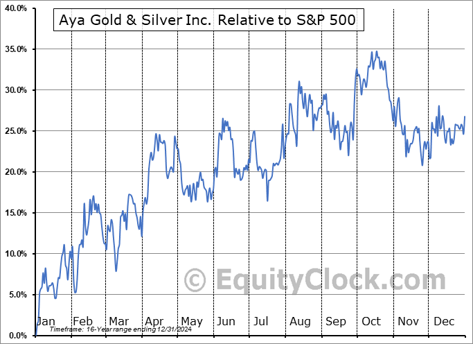 Analysis of the Aya Gold & Silver Inc. (TSE:AYA.TO) seasonal charts above shows that a Buy Date of November 25 and a Sell Date of April 15 has resulted in a geometric average return of 16.41% above the benchmark rate of the S&P 500 Total Return Index over the past 16 years. This seasonal timeframe has shown positive results compared to the benchmark in 12 of those periods. This is a good rate of success and the return strongly outperforms the relative buy-and-hold performance of the stock over the past 16 years by an average of 11.65% per year.