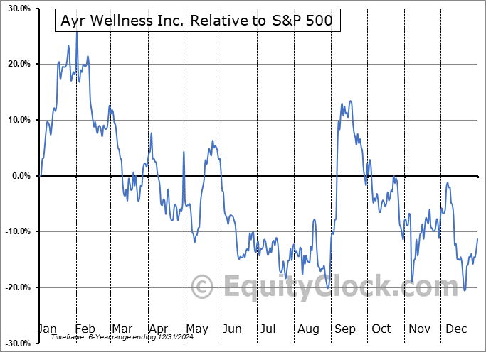 Analysis of the Ayr Wellness Inc. (OTCMKT:AYRWF) seasonal charts above shows that a Buy Date of December 21 and a Sell Date of April 3 has resulted in a geometric average return of 5.76% above the benchmark rate of the S&P 500 Total Return Index over the past 6 years. This seasonal timeframe has shown positive results compared to the benchmark in 4 of those periods. This is a good rate of success and the return strongly outperforms the relative buy-and-hold performance of the stock over the past 6 years by an average of 55.25% per year.