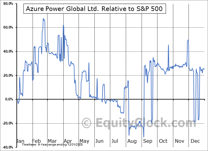 Analysis of the Azure Power Global Ltd. (NYSE:AZREF) seasonal charts above shows that a Buy Date of August 30 and a Sell Date of November 20 has resulted in a geometric average return of 20.01% above the benchmark rate of the S&P 500 Total Return Index over the past 8 years. This seasonal timeframe has shown positive results compared to the benchmark in 6 of those periods. This is a good rate of success and the return strongly outperforms the relative buy-and-hold performance of the stock over the past 8 years by an average of 70.02% per year.