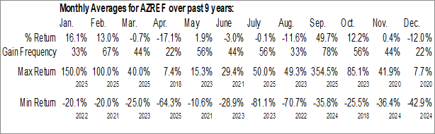 A word of caution: Only 8 years of data is available for shares of AZREF, perhaps insufficient to create a seasonal profile that accurately gauges the seasonal tendencies influencing the investment. Ideally, while 20 years is preferred, at least 10 years of data is required to perform a seasonal analysis that is considered to be reliable for future seasonal periods.
