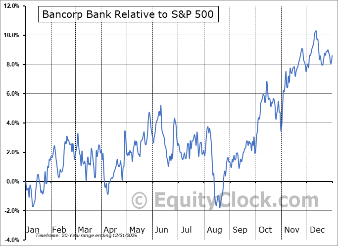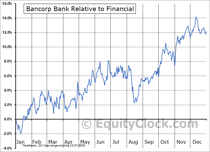 The seasonal timeframe correlates Poorly with the period of seasonal strength for the Financial sector, which runs from November 22 to April 13. The seasonal chart for the broad sector is available via the following link: Financial Sector Seasonal Chart.