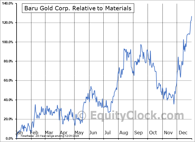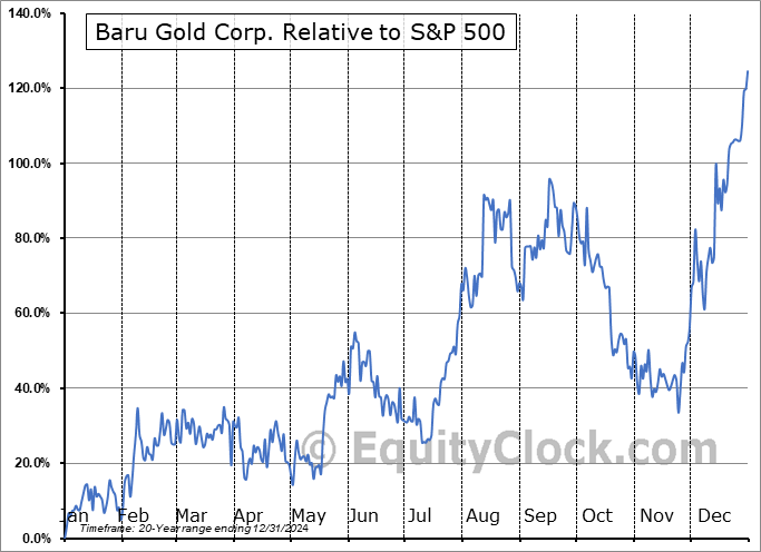 Analysis of the Baru Gold Corp. (TSXV:BARU.V) seasonal charts above shows that a Buy Date of July 18 and a Sell Date of October 6 has resulted in a geometric average return of 4.23% above the benchmark rate of the S&P 500 Total Return Index over the past 20 years. This seasonal timeframe has shown positive results compared to the benchmark in 15 of those periods. This is a good rate of success and the return strongly outperforms the relative buy-and-hold performance of the stock over the past 20 years by an average of 31.32% per year.