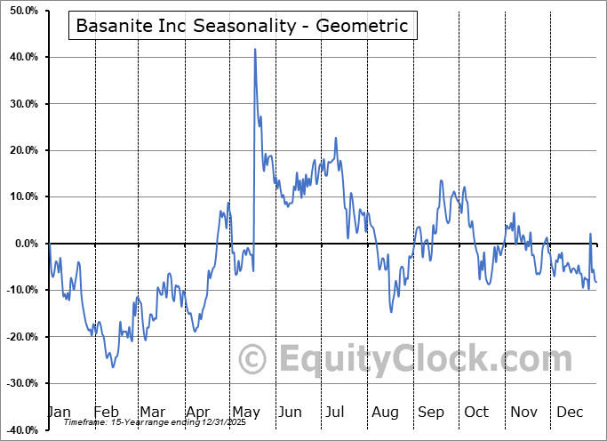 Analysis of the Basanite Inc (OTCMKT:BASA) seasonal charts above shows that a Buy Date of February 6 and a Sell Date of April 27 has resulted in a geometric average return of 29.94% above the benchmark rate of the S&P 500 Total Return Index over the past 15 years. This seasonal timeframe has shown positive results compared to the benchmark in 12 of those periods. This is a very good rate of success and the return strongly outperforms the relative buy-and-hold performance of the stock over the past 15 years by an average of 49.36% per year.