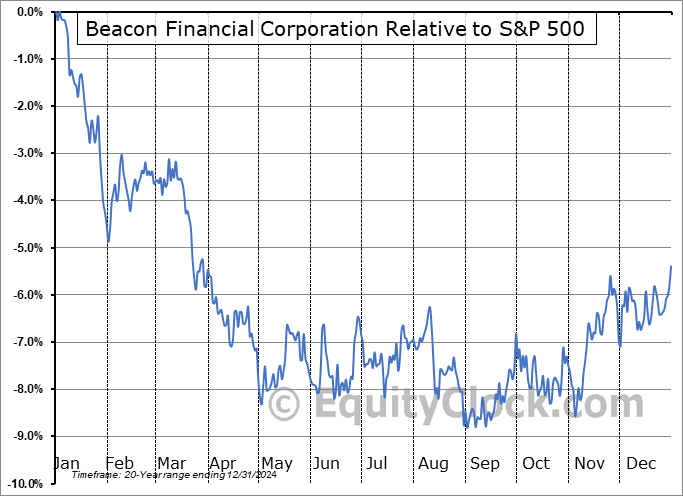 Analysis of the Beacon Financial Corporation (NYSE:BBT) seasonal charts above shows that a Buy Date of September 23 and a Sell Date of January 1 has resulted in a geometric average return of 4.72% above the benchmark rate of the S&P 500 Total Return Index over the past 20 years. This seasonal timeframe has shown positive results compared to the benchmark in 15 of those periods. This is a good rate of success and the return strongly outperforms the relative buy-and-hold performance of the stock over the past 20 years by an average of 12.91% per year.