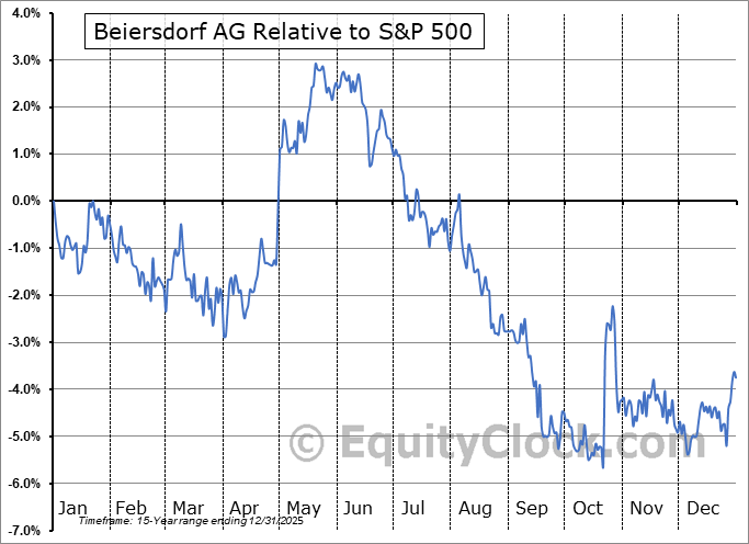 Analysis of the Beiersdorf AG (OTCMKT:BDRFY) seasonal charts above shows that a Buy Date of March 5 and a Sell Date of June 5 has resulted in a geometric average return of 4.97% above the benchmark rate of the S&P 500 Total Return Index over the past 15 years. This seasonal timeframe has shown positive results compared to the benchmark in 12 of those periods. This is a very good rate of success and the return strongly outperforms the relative buy-and-hold performance of the stock over the past 15 years by an average of 12.01% per year.
