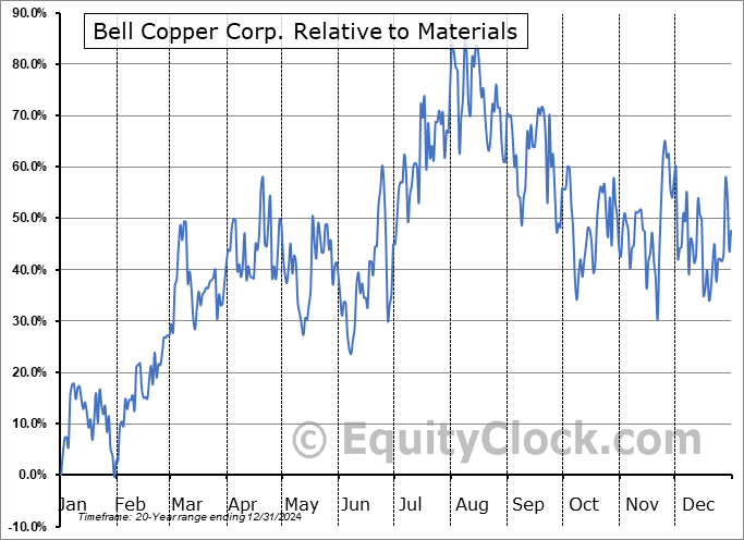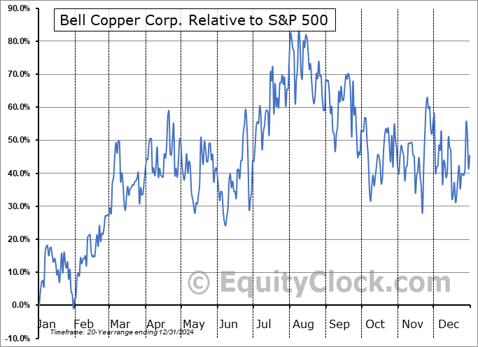 Analysis of the Bell Copper Corp. (TSXV:BCU.V) seasonal charts above shows that a Buy Date of December 19 and a Sell Date of April 30 has resulted in a geometric average return of 31.82% above the benchmark rate of the S&P 500 Total Return Index over the past 20 years. This seasonal timeframe has shown positive results compared to the benchmark in 15 of those periods. This is a good rate of success and the return strongly outperforms the relative buy-and-hold performance of the stock over the past 20 years by an average of 56.91% per year.