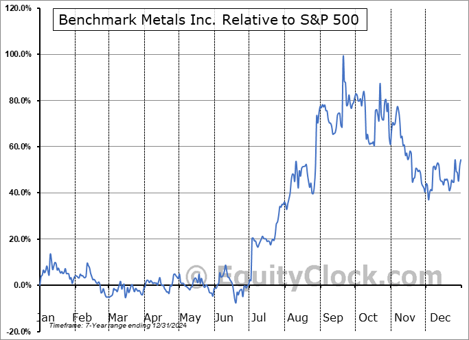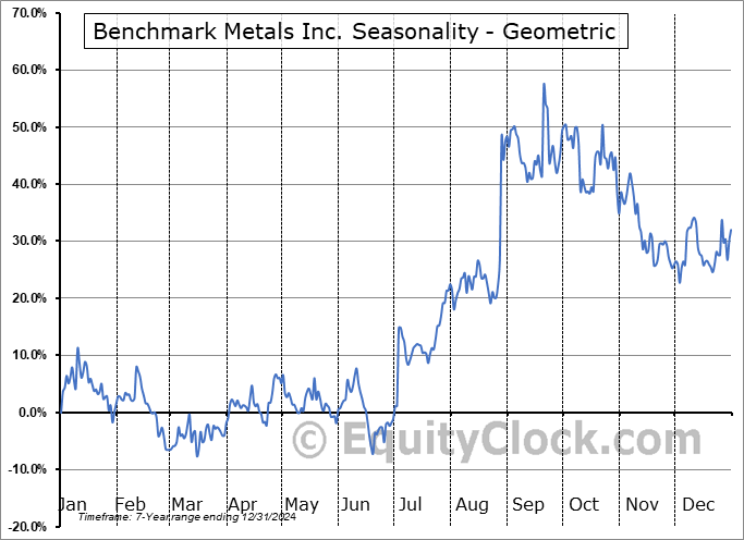 Analysis of the Benchmark Metals Inc. (OTCMKT:CYRTF) seasonal charts above shows that a Buy Date of July 12 and a Sell Date of September 30 has resulted in a geometric average return of 33.58% above the benchmark rate of the S&P 500 Total Return Index over the past 7 years. This seasonal timeframe has shown positive results compared to the benchmark in 6 of those periods. This is a very good rate of success and the return strongly outperforms the relative buy-and-hold performance of the stock over the past 7 years by an average of 17.33% per year.