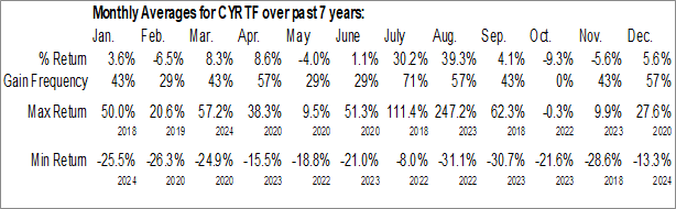 A word of caution: Only 7 years of data is available for shares of CYRTF, perhaps insufficient to create a seasonal profile that accurately gauges the seasonal tendencies influencing the investment. Ideally, while 20 years is preferred, at least 10 years of data is required to perform a seasonal analysis that is considered to be reliable for future seasonal periods.