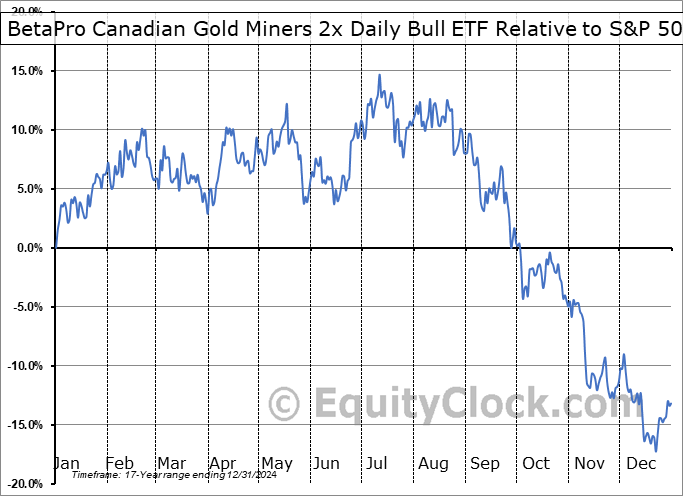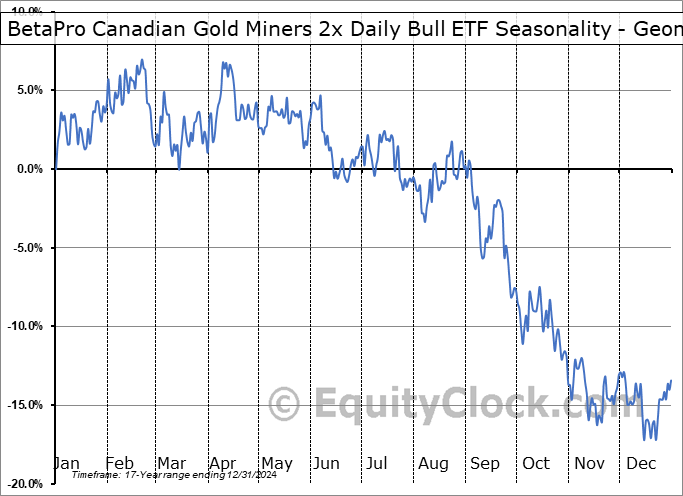 Analysis of the BetaPro Canadian Gold Miners 2x Daily Bull ETF (TSE:GDXU.TO) seasonal charts above shows that a Buy Date of December 11 and a Sell Date of April 15 has resulted in a geometric average return of 4.41% above the benchmark rate of the S&P 500 Total Return Index over the past 17 years. This seasonal timeframe has shown positive results compared to the benchmark in 12 of those periods. This is a good rate of success and the return strongly outperforms the relative buy-and-hold performance of the stock over the past 17 years by an average of 27.21% per year.