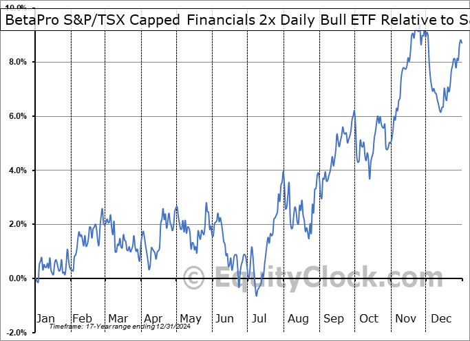Analysis of the BetaPro S&P/TSX Capped Financials 2x Daily Bull ETF (TSE:CFOU.TO) seasonal charts above shows that a Buy Date of July 9 and a Sell Date of September 30 has resulted in a geometric average return of 5.07% above the benchmark rate of the S&P 500 Total Return Index over the past 17 years. This seasonal timeframe has shown positive results compared to the benchmark in 13 of those periods. This is a good rate of success and the return strongly outperforms the relative buy-and-hold performance of the stock over the past 17 years by an average of 5.07% per year.