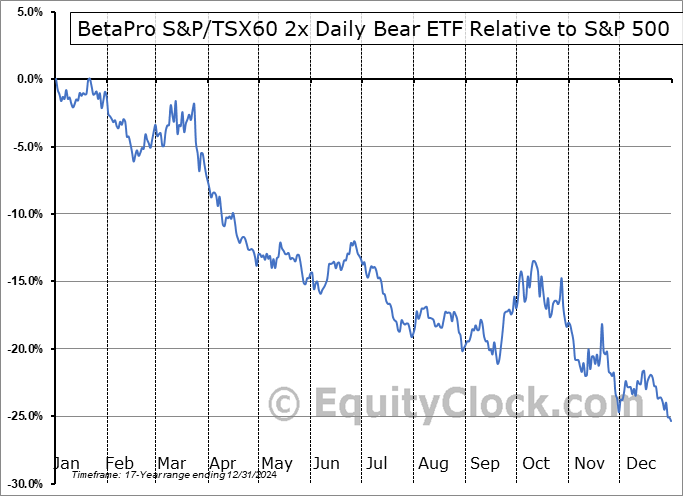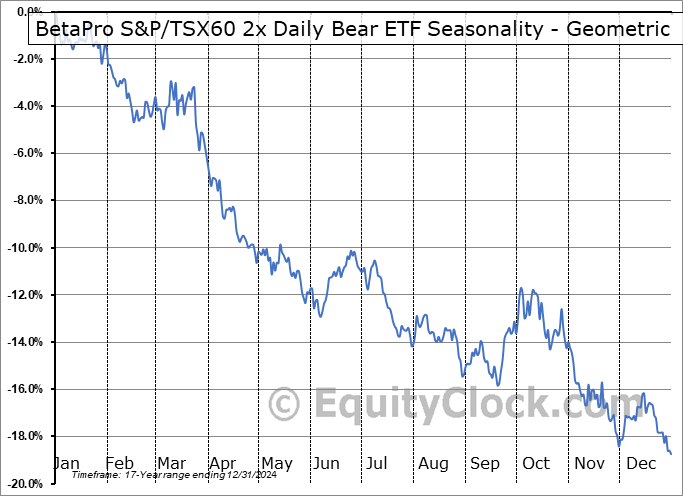 Analysis of the BetaPro S&P/TSX60 2x Daily Bear ETF (TSE:CNDD.TO) seasonal charts above shows that a Buy Date of July 23 and a Sell Date of October 12 has resulted in a geometric average return of 3.95% above the benchmark rate of the S&P 500 Total Return Index over the past 17 years. This seasonal timeframe has shown positive results compared to the benchmark in 8 of those periods. This is a poor rate of success and the return strongly outperforms the relative buy-and-hold performance of the stock over the past 17 years by an average of 30.64% per year.