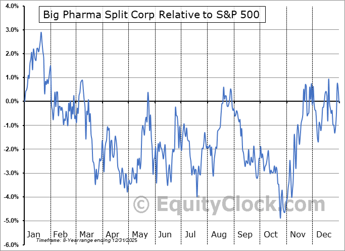 Analysis of the Big Pharma Split Corp (TSE:PRM.TO) seasonal charts above shows that a Buy Date of October 25 and a Sell Date of March 7 has resulted in a geometric average return of 2.51% above the benchmark rate of the S&P 500 Total Return Index over the past 7 years. This seasonal timeframe has shown positive results compared to the benchmark in 6 of those periods. This is a very good rate of success and the return strongly outperforms the relative buy-and-hold performance of the stock over the past 7 years by an average of 6.57% per year.