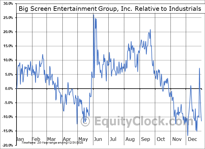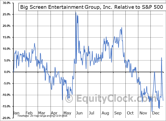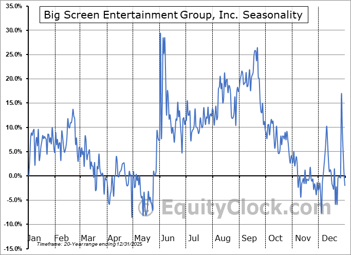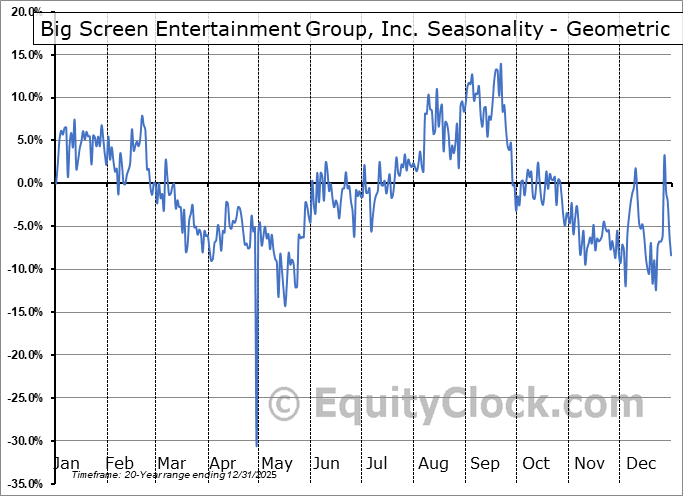 Analysis of the Big Screen Entertainment Group, Inc. (OTCMKT:BSEG) seasonal charts above shows that a Buy Date of May 12 and a Sell Date of August 19 has resulted in a geometric average return of 23.16% above the benchmark rate of the S&P 500 Total Return Index over the past 20 years. This seasonal timeframe has shown positive results compared to the benchmark in 16 of those periods. This is a very good rate of success and the return strongly outperforms the relative buy-and-hold performance of the stock over the past 20 years by an average of 38.82% per year.