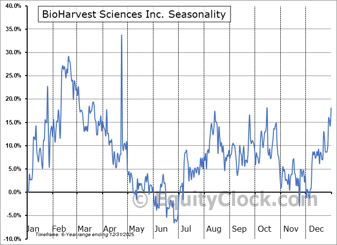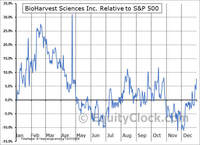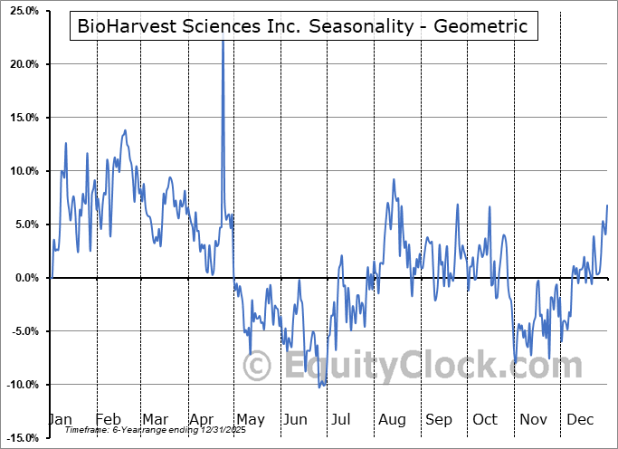 Analysis of the BioHarvest Sciences Inc. (NASD:BHST) seasonal charts above shows that a Buy Date of November 23 and a Sell Date of March 19 has resulted in a geometric average return of 32.39% above the benchmark rate of the S&P 500 Total Return Index over the past 6 years. This seasonal timeframe has shown positive results compared to the benchmark in 5 of those periods. This is a very good rate of success and the return strongly outperforms the relative buy-and-hold performance of the stock over the past 6 years by an average of 39.5% per year.