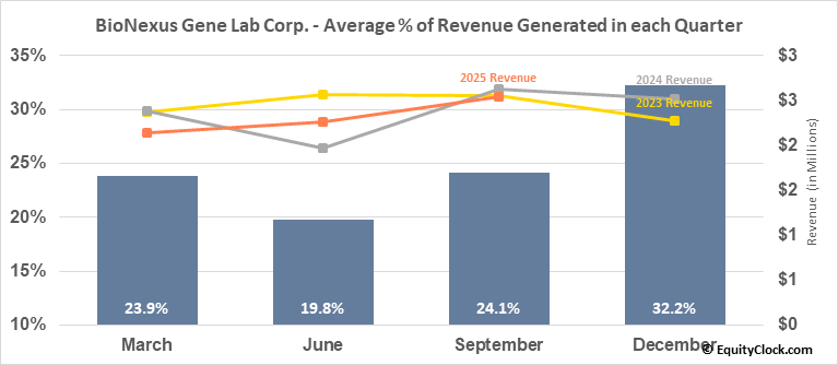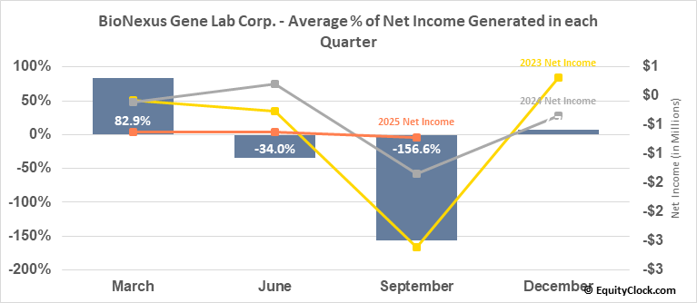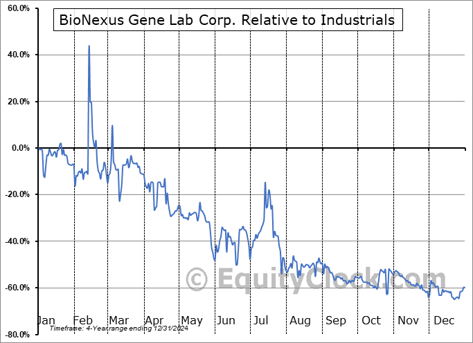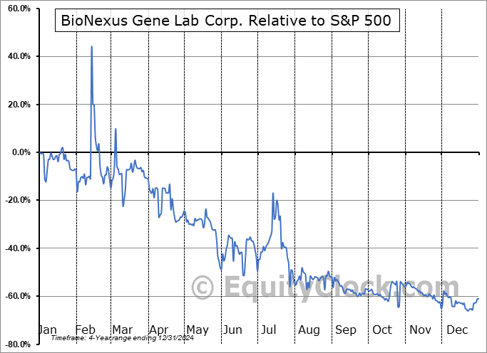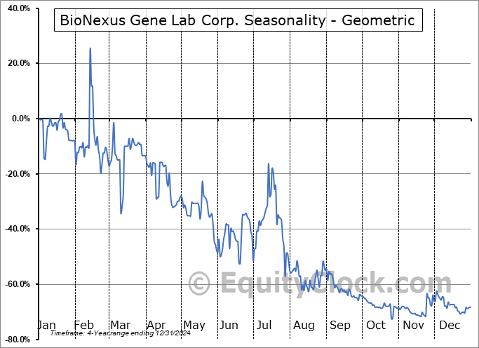 Analysis of the BioNexus Gene Lab Corp. (NASD:BGLC) seasonal charts above shows that a Buy Date of October 25 and a Sell Date of February 15 has resulted in a geometric average return of 45.39% above the benchmark rate of the S&P 500 Total Return Index over the past 4 years. This seasonal timeframe has shown positive results compared to the benchmark in 3 of those periods. This is a good rate of success and the return strongly outperforms the relative buy-and-hold performance of the stock over the past 4 years by an average of 117.44% per year.
