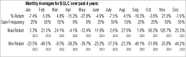 A word of caution: Only 4 years of data is available for shares of BGLC, perhaps insufficient to create a seasonal profile that accurately gauges the seasonal tendencies influencing the investment. Ideally, while 20 years is preferred, at least 10 years of data is required to perform a seasonal analysis that is considered to be reliable for future seasonal periods.