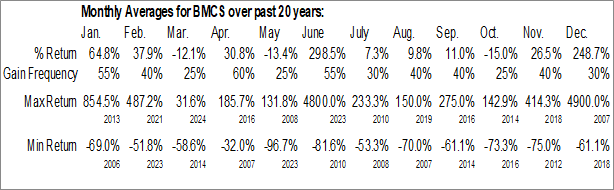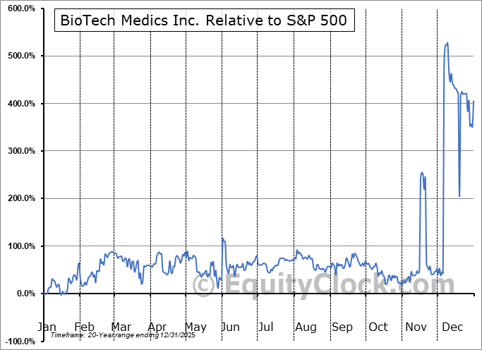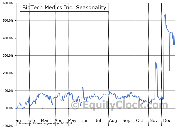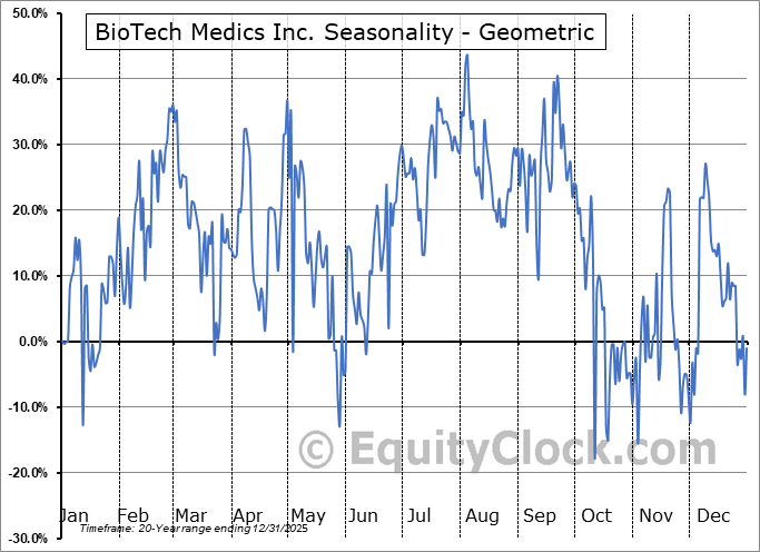 Analysis of the BioTech Medics Inc. (OTCMKT:BMCS) seasonal charts above shows that a Buy Date of November 3 and a Sell Date of February 27 has resulted in a geometric average return of 46.71% above the benchmark rate of the S&P 500 Total Return Index over the past 20 years. This seasonal timeframe has shown positive results compared to the benchmark in 14 of those periods. This is a good rate of success and the return strongly outperforms the relative buy-and-hold performance of the stock over the past 20 years by an average of 63.95% per year.