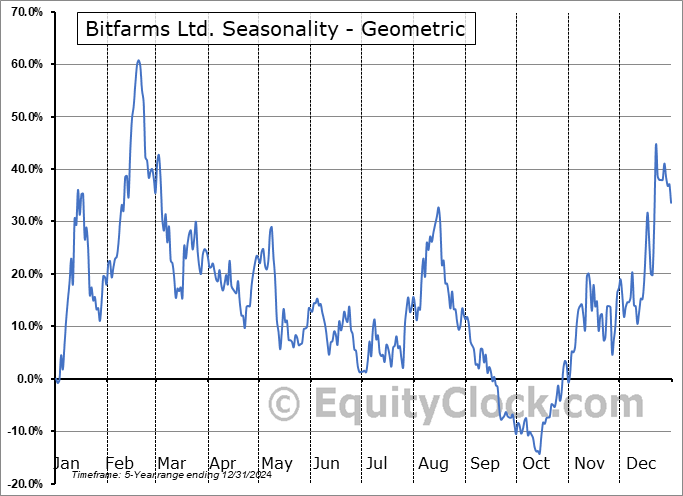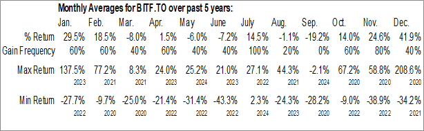 A word of caution: Only 5 years of data is available for shares of BITF.TO, perhaps insufficient to create a seasonal profile that accurately gauges the seasonal tendencies influencing the investment. Ideally, while 20 years is preferred, at least 10 years of data is required to perform a seasonal analysis that is considered to be reliable for future seasonal periods.