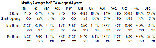 A word of caution: Only 4 years of data is available for shares of BITW, perhaps insufficient to create a seasonal profile that accurately gauges the seasonal tendencies influencing the investment. Ideally, while 20 years is preferred, at least 10 years of data is required to perform a seasonal analysis that is considered to be reliable for future seasonal periods.