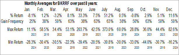 A word of caution: Only 8 years of data is available for shares of BKRRF, perhaps insufficient to create a seasonal profile that accurately gauges the seasonal tendencies influencing the investment. Ideally, while 20 years is preferred, at least 10 years of data is required to perform a seasonal analysis that is considered to be reliable for future seasonal periods.