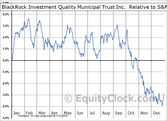 Analysis of the BlackRock Investment Quality Municipal Trust Inc. (NYSE:BKN) seasonal charts above shows that a Buy Date of November 14 and a Sell Date of March 4 has resulted in a geometric average return of 1.92% above the benchmark rate of the S&P 500 Total Return Index over the past 20 years. This seasonal timeframe has shown positive results compared to the benchmark in 15 of those periods. This is a good rate of success and the return strongly outperforms the relative buy-and-hold performance of the stock over the past 20 years by an average of 7.29% per year.
