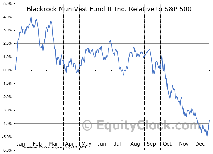 Analysis of the Blackrock MuniVest Fund II Inc. (NYSE:MVT) seasonal charts above shows that a Buy Date of December 7 and a Sell Date of March 10 has resulted in a geometric average return of 2.99% above the benchmark rate of the S&P 500 Total Return Index over the past 20 years. This seasonal timeframe has shown positive results compared to the benchmark in 14 of those periods. This is a good rate of success and the return strongly outperforms the relative buy-and-hold performance of the stock over the past 20 years by an average of 8.68% per year.