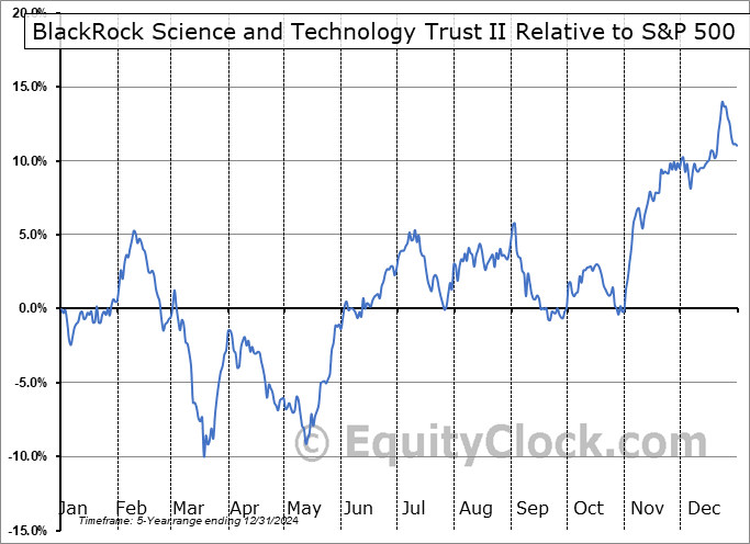 Analysis of the BlackRock Science and Technology Trust II (NYSE:BSTZ) seasonal charts above shows that a Buy Date of May 12 and a Sell Date of August 10 has resulted in a geometric average return of 6.36% above the benchmark rate of the S&P 500 Total Return Index over the past 5 years. This seasonal timeframe has shown positive results compared to the benchmark in 5 of those periods. This is an excellent rate of success and the return strongly outperforms the relative buy-and-hold performance of the stock over the past 5 years by an average of 10.72% per year.