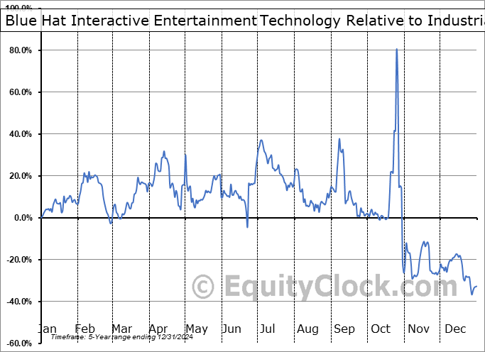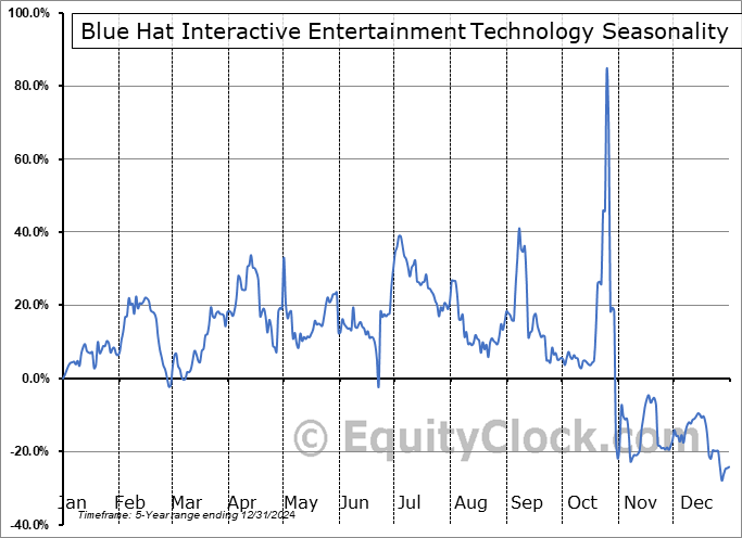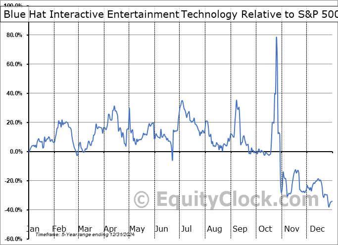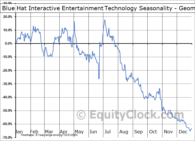 Analysis of the Blue Hat Interactive Entertainment Technology (NASD:BHAT) seasonal charts above shows that a Buy Date of February 28 and a Sell Date of July 2 has resulted in a geometric average return of 19.17% above the benchmark rate of the S&P 500 Total Return Index over the past 5 years. This seasonal timeframe has shown positive results compared to the benchmark in 4 of those periods. This is a very good rate of success and the return strongly outperforms the relative buy-and-hold performance of the stock over the past 5 years by an average of 87.09% per year.