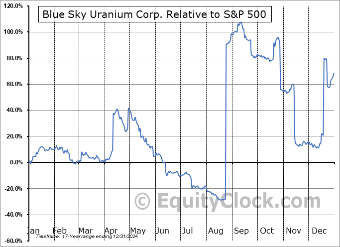 Analysis of the Blue Sky Uranium Corp. (OTCMKT:BKUCF) seasonal charts above shows that a Buy Date of August 20 and a Sell Date of January 16 has resulted in a geometric average return of 37.41% above the benchmark rate of the S&P 500 Total Return Index over the past 16 years. This seasonal timeframe has shown positive results compared to the benchmark in 11 of those periods. This is a good rate of success and the return strongly outperforms the relative buy-and-hold performance of the stock over the past 16 years by an average of 57.75% per year.
