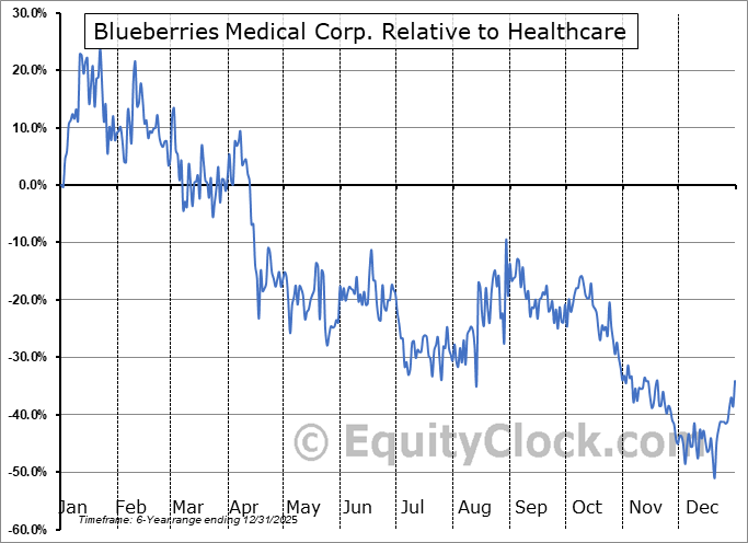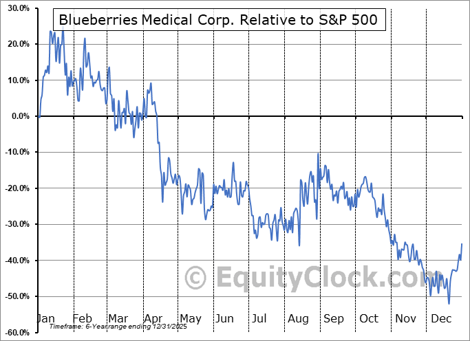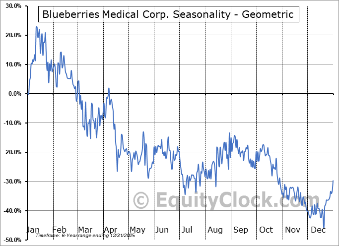 Analysis of the Blueberries Medical Corp. (OTCMKT:BBRRF) seasonal charts above shows that a Buy Date of December 3 and a Sell Date of March 1 has resulted in a geometric average return of 46.9% above the benchmark rate of the S&P 500 Total Return Index over the past 5 years. This seasonal timeframe has shown positive results compared to the benchmark in 4 of those periods. This is a very good rate of success and the return strongly outperforms the relative buy-and-hold performance of the stock over the past 5 years by an average of 94.61% per year.