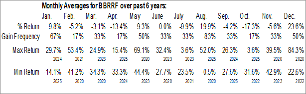 A word of caution: Only 5 years of data is available for shares of BBRRF, perhaps insufficient to create a seasonal profile that accurately gauges the seasonal tendencies influencing the investment. Ideally, while 20 years is preferred, at least 10 years of data is required to perform a seasonal analysis that is considered to be reliable for future seasonal periods.