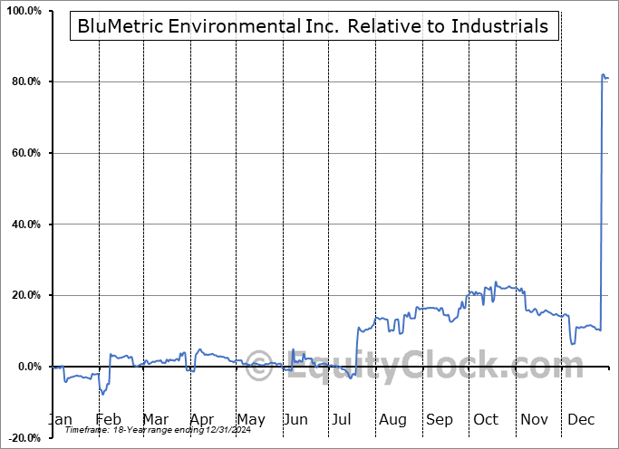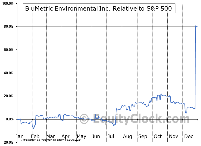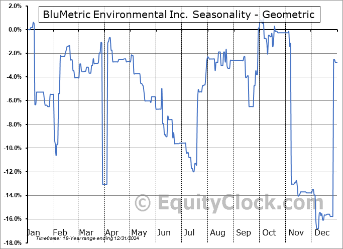 Analysis of the BluMetric Environmental Inc. (OTCMKT:BLMWF) seasonal charts above shows that a Buy Date of July 15 and a Sell Date of October 9 has resulted in a geometric average return of 13.07% above the benchmark rate of the S&P 500 Total Return Index over the past 18 years. This seasonal timeframe has shown positive results compared to the benchmark in 12 of those periods. This is a good rate of success and the return strongly outperforms the relative buy-and-hold performance of the stock over the past 18 years by an average of 24.93% per year.