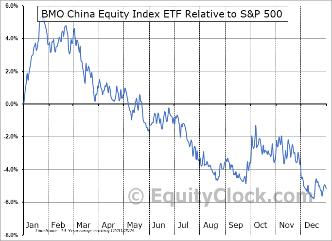 Analysis of the BMO China Equity Index ETF (TSE:ZCH.TO) seasonal charts above shows that a Buy Date of December 9 and a Sell Date of March 1 has resulted in a geometric average return of 1.21% above the benchmark rate of the S&P 500 Total Return Index over the past 14 years. This seasonal timeframe has shown positive results compared to the benchmark in 9 of those periods. This is a fair rate of success and the return strongly outperforms the relative buy-and-hold performance of the stock over the past 14 years by an average of 12.19% per year.