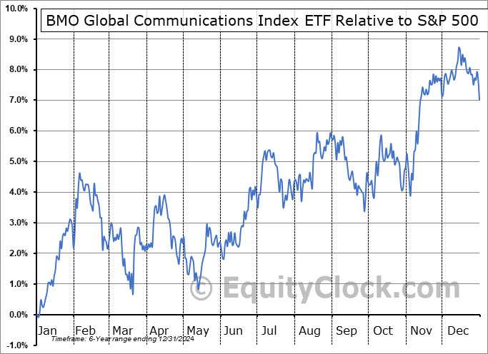 Analysis of the BMO Global Communications Index ETF (TSE:COMM.TO) seasonal charts above shows that a Buy Date of June 8 and a Sell Date of September 30 has resulted in a geometric average return of 1.79% above the benchmark rate of the S&P 500 Total Return Index over the past 6 years. This seasonal timeframe has shown positive results compared to the benchmark in 5 of those periods. This is a very good rate of success and the return strongly outperforms the relative buy-and-hold performance of the stock over the past 6 years by an average of 4.13% per year.