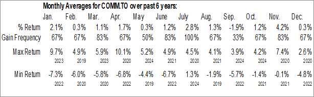 A word of caution: Only 6 years of data is available for shares of COMM.TO, perhaps insufficient to create a seasonal profile that accurately gauges the seasonal tendencies influencing the investment. Ideally, while 20 years is preferred, at least 10 years of data is required to perform a seasonal analysis that is considered to be reliable for future seasonal periods.