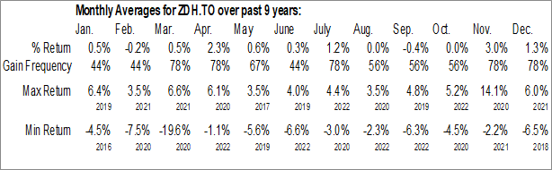 A word of caution: Only 8 years of data is available for shares of ZDH.TO, perhaps insufficient to create a seasonal profile that accurately gauges the seasonal tendencies influencing the investment. Ideally, while 20 years is preferred, at least 10 years of data is required to perform a seasonal analysis that is considered to be reliable for future seasonal periods.