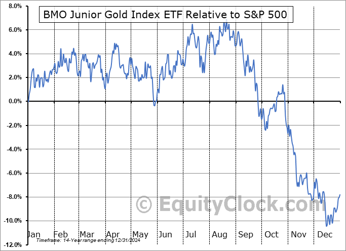 Analysis of the BMO Junior Gold Index ETF (TSE:ZJG.TO) seasonal charts above shows that a Buy Date of December 15 and a Sell Date of April 9 has resulted in a geometric average return of 3.83% above the benchmark rate of the S&P 500 Total Return Index over the past 14 years. This seasonal timeframe has shown positive results compared to the benchmark in 10 of those periods. This is a good rate of success and the return strongly outperforms the relative buy-and-hold performance of the stock over the past 14 years by an average of 18.05% per year.