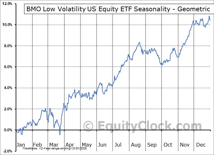 Analysis of the BMO Low Volatility US Equity ETF (TSE:ZLU/U.TO) seasonal charts above shows that a Buy Date of February 4 and a Sell Date of April 24 has resulted in a geometric average return of 1.07% above the benchmark rate of the S&P 500 Total Return Index over the past 11 years. This seasonal timeframe has shown positive results compared to the benchmark in 8 of those periods. This is a good rate of success and the return strongly outperforms the relative buy-and-hold performance of the stock over the past 11 years by an average of 3.62% per year.