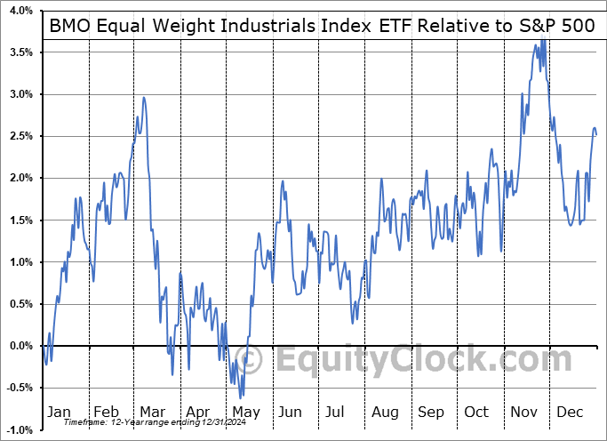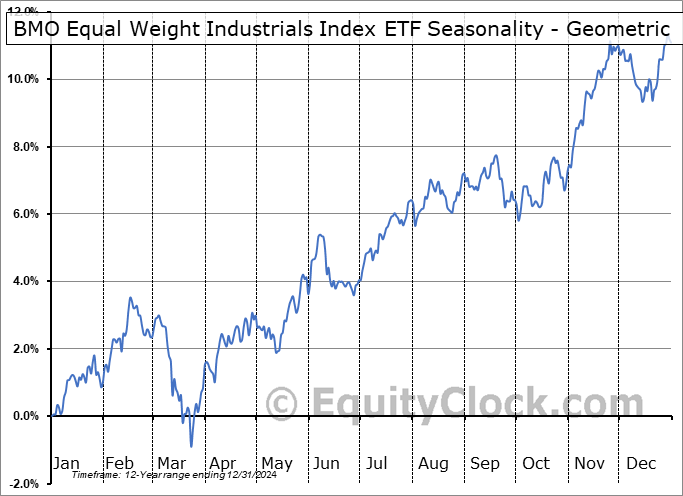 Analysis of the BMO Equal Weight Industrials Index ETF (TSE:ZIN.TO) seasonal charts above shows that a Buy Date of December 9 and a Sell Date of February 27 has resulted in a geometric average return of 1.58% above the benchmark rate of the S&P 500 Total Return Index over the past 12 years. This seasonal timeframe has shown positive results compared to the benchmark in 10 of those periods. This is a very good rate of success and the return strongly outperforms the relative buy-and-hold performance of the stock over the past 12 years by an average of 4.6% per year.