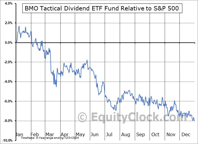 Analysis of the BMO Tactical Dividend ETF Fund (TSE:ZZZD.TO) seasonal charts above shows that a Buy Date of February 15 and a Sell Date of May 12 has resulted in a geometric average return of 2.66% above the benchmark rate of the S&P 500 Total Return Index over the past 5 years. This seasonal timeframe has shown positive results compared to the benchmark in 4 of those periods. This is a very good rate of success and the return strongly outperforms the relative buy-and-hold performance of the stock over the past 5 years by an average of 13.98% per year.