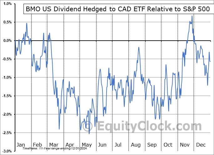 Analysis of the BMO US Dividend Hedged to CAD ETF (TSE:ZUD.TO) seasonal charts above shows that a Buy Date of September 2 and a Sell Date of December 20 has resulted in a geometric average return of 0.96% above the benchmark rate of the S&P 500 Total Return Index over the past 11 years. This seasonal timeframe has shown positive results compared to the benchmark in 9 of those periods. This is a very good rate of success and the return strongly outperforms the relative buy-and-hold performance of the stock over the past 11 years by an average of 4.9% per year.