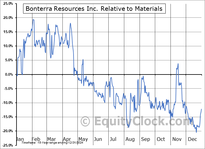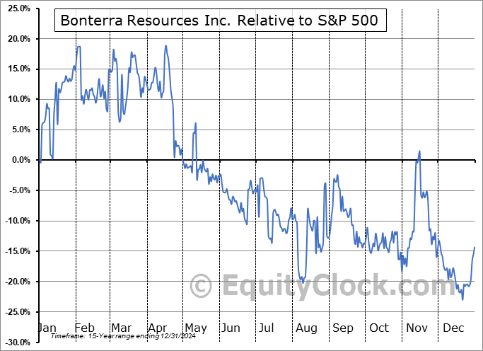 Analysis of the Bonterra Resources Inc. (TSXV:BTR.V) seasonal charts above shows that a Buy Date of December 21 and a Sell Date of March 10 has resulted in a geometric average return of 10.28% above the benchmark rate of the S&P 500 Total Return Index over the past 15 years. This seasonal timeframe has shown positive results compared to the benchmark in 9 of those periods. This is a fair rate of success and the return strongly outperforms the relative buy-and-hold performance of the stock over the past 15 years by an average of 48.67% per year.