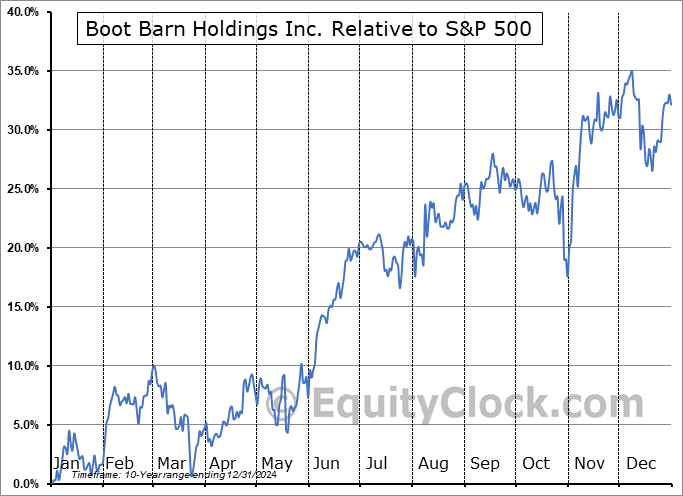 Analysis of the Boot Barn Holdings Inc. (NYSE:BOOT) seasonal charts above shows that a Buy Date of May 24 and a Sell Date of August 22 has resulted in a geometric average return of 12.17% above the benchmark rate of the S&P 500 Total Return Index over the past 10 years. This seasonal timeframe has shown positive results compared to the benchmark in 10 of those periods. This is an excellent rate of success and the return strongly outperforms the relative buy-and-hold performance of the stock over the past 10 years by an average of 2.61% per year.