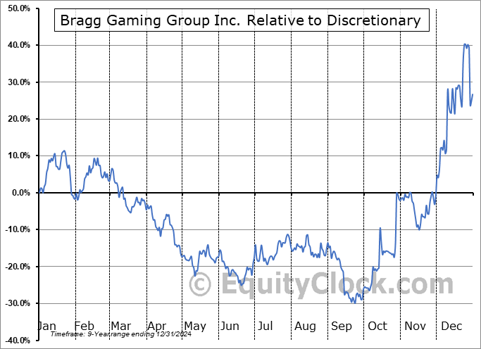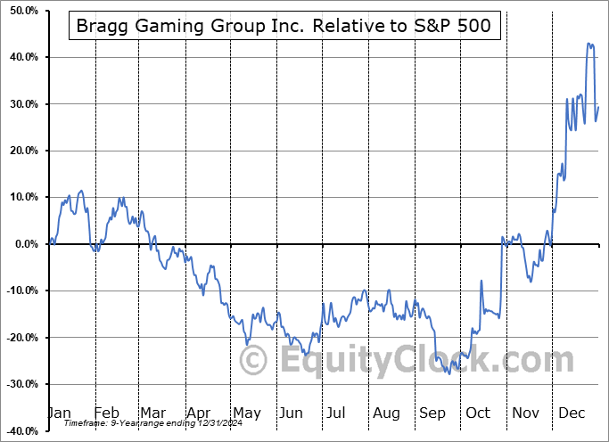 Analysis of the Bragg Gaming Group Inc. (NASD:BRAG) seasonal charts above shows that a Buy Date of October 16 and a Sell Date of January 10 has resulted in a geometric average return of 26.4% above the benchmark rate of the S&P 500 Total Return Index over the past 9 years. This seasonal timeframe has shown positive results compared to the benchmark in 7 of those periods. This is a good rate of success and the return strongly outperforms the relative buy-and-hold performance of the stock over the past 9 years by an average of 52.07% per year.