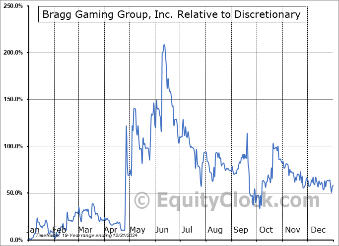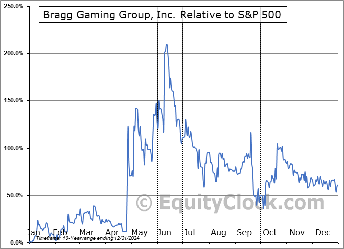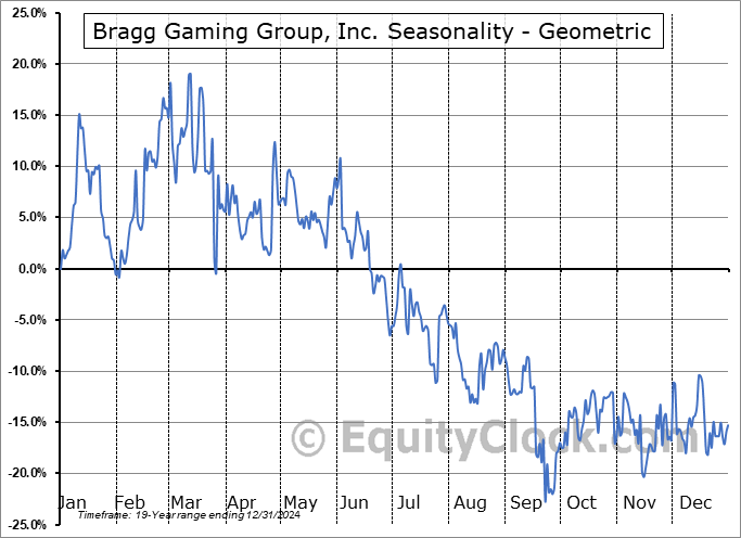 Analysis of the Bragg Gaming Group, Inc. (TSE:BRAG.TO) seasonal charts above shows that a Buy Date of December 11 and a Sell Date of March 10 has resulted in a geometric average return of 13.4% above the benchmark rate of the S&P 500 Total Return Index over the past 19 years. This seasonal timeframe has shown positive results compared to the benchmark in 13 of those periods. This is a good rate of success and the return strongly outperforms the relative buy-and-hold performance of the stock over the past 19 years by an average of 36.62% per year.