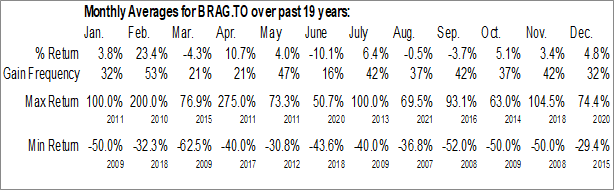 To download BRAG.TO seasonal chart data, please log in or Subscribe.