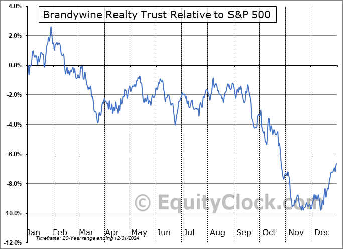 Analysis of the Brandywine Realty Trust (NYSE:BDN) seasonal charts above shows that a Buy Date of November 19 and a Sell Date of February 12 has resulted in a geometric average return of 3.52% above the benchmark rate of the S&P 500 Total Return Index over the past 20 years. This seasonal timeframe has shown positive results compared to the benchmark in 15 of those periods. This is a good rate of success and the return strongly outperforms the relative buy-and-hold performance of the stock over the past 20 years by an average of 14.47% per year.