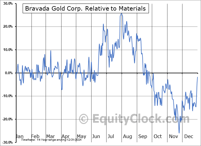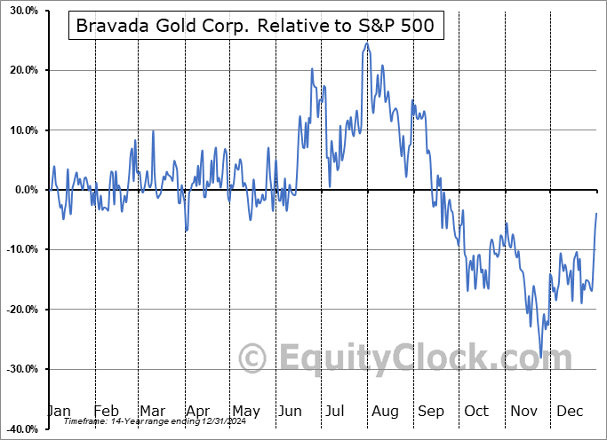 Analysis of the Bravada Gold Corp. (TSXV:BVA.V) seasonal charts above shows that a Buy Date of November 24 and a Sell Date of March 10 has resulted in a geometric average return of 22.25% above the benchmark rate of the S&P 500 Total Return Index over the past 14 years. This seasonal timeframe has shown positive results compared to the benchmark in 11 of those periods. This is a good rate of success and the return strongly outperforms the relative buy-and-hold performance of the stock over the past 14 years by an average of 60.04% per year.