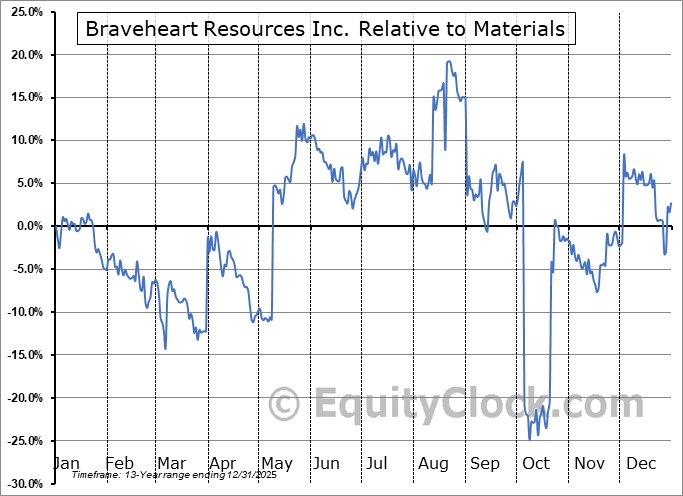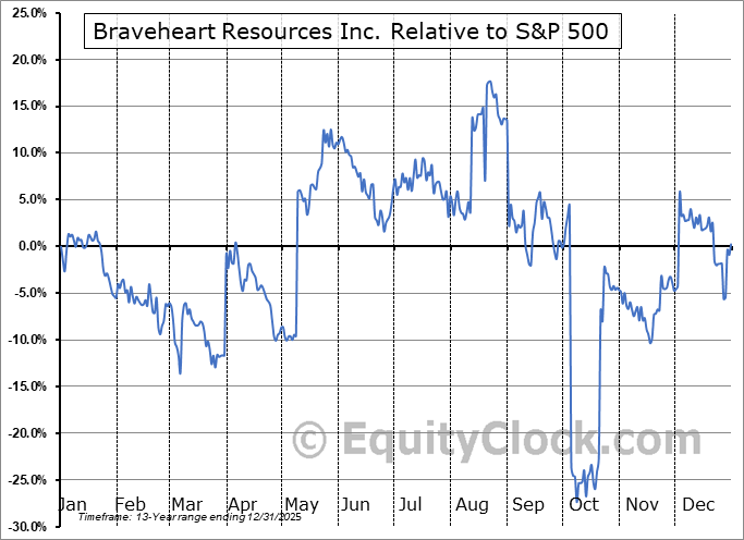 Analysis of the Braveheart Resources Inc. (OTCMKT:RIINF) seasonal charts above shows that a Buy Date of June 21 and a Sell Date of September 9 has resulted in a geometric average return of 2.93% above the benchmark rate of the S&P 500 Total Return Index over the past 12 years. This seasonal timeframe has shown positive results compared to the benchmark in 8 of those periods. This is a good rate of success and the return strongly outperforms the relative buy-and-hold performance of the stock over the past 12 years by an average of 27.21% per year.