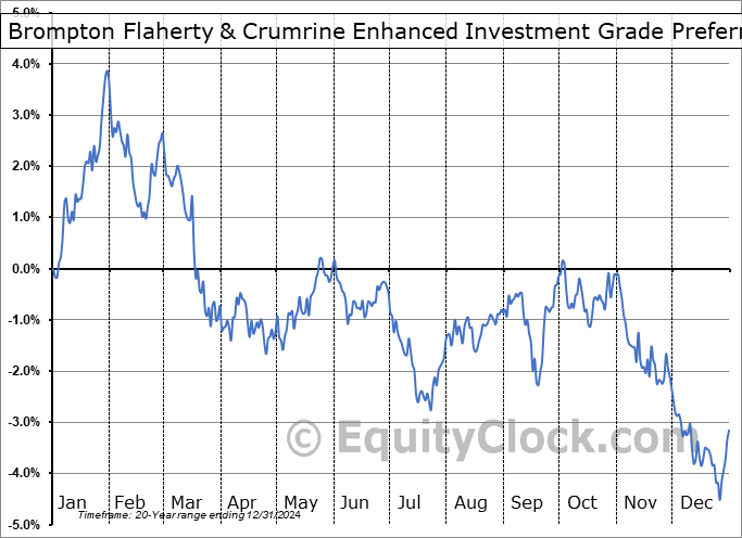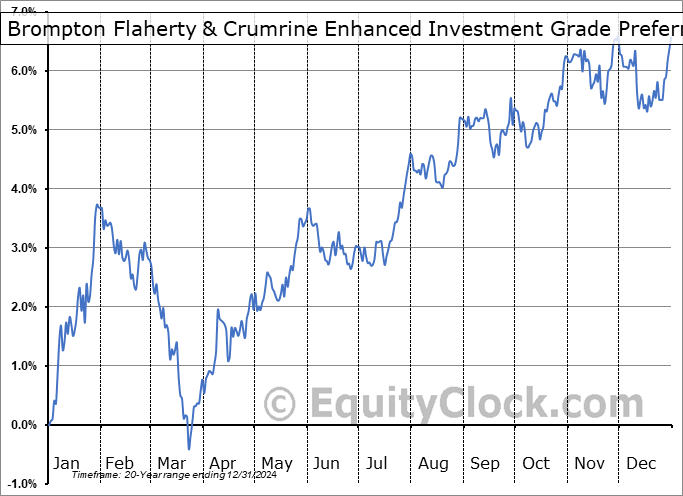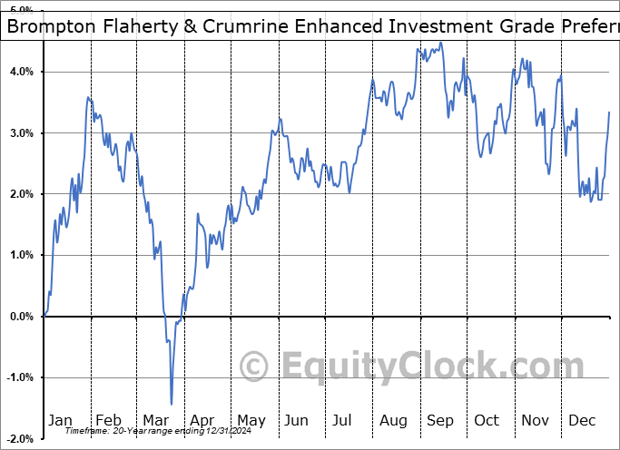 Analysis of the Brompton Flaherty & Crumrine Enhanced Investment Grade Preferred ETF (TSE:BEPR.TO) seasonal charts above shows that a Buy Date of July 16 and a Sell Date of October 12 has resulted in a geometric average return of 1.19% above the benchmark rate of the S&P 500 Total Return Index over the past 19 years. This seasonal timeframe has shown positive results compared to the benchmark in 14 of those periods. This is a good rate of success and the return strongly outperforms the relative buy-and-hold performance of the stock over the past 19 years by an average of 7.9% per year.